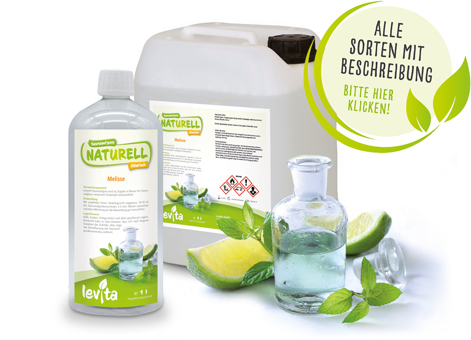 Natürliche Saunaaufgusskonzentrate auf der Basis reiner ätherischer Öle, die durch bspw. Pressung, Wasserdampfdestillation oder Mazeration von natürlichen Pflanzen und Pflanzenteilen gewonnen werden.